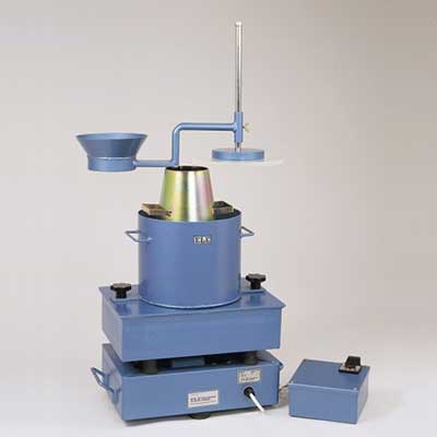 The assembly is mounted upon a small vibrating table operating at a fixed amplitude and frequency. The time to complete the required vibration gives an indication of the concrete workability.